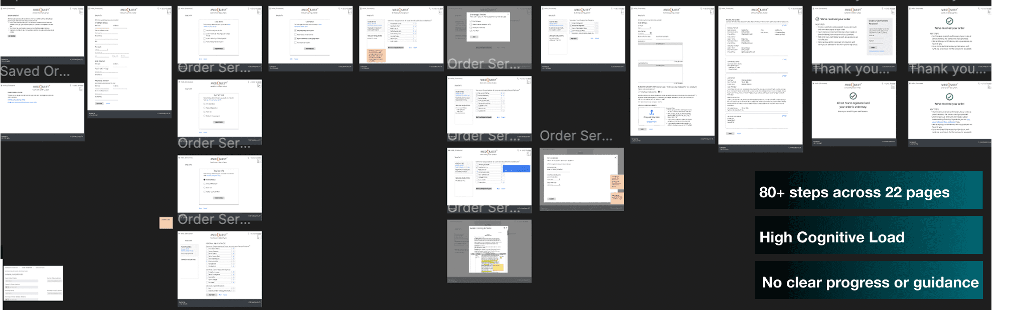 The ordering experience was overly complex and time-intensive, requiring over 80 steps across 22 screens to complete—leading to confusion, inefficiency, and high cognitive load. These challenges were further constrained by legacy system limitations and accessibility requirements.